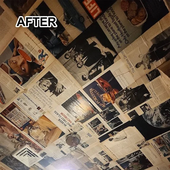 Instead of just painting, we applied authentic vintage magazine pages with industrial adhesive to match the restaurant’s unique, retro bathroom theme 🎨📚